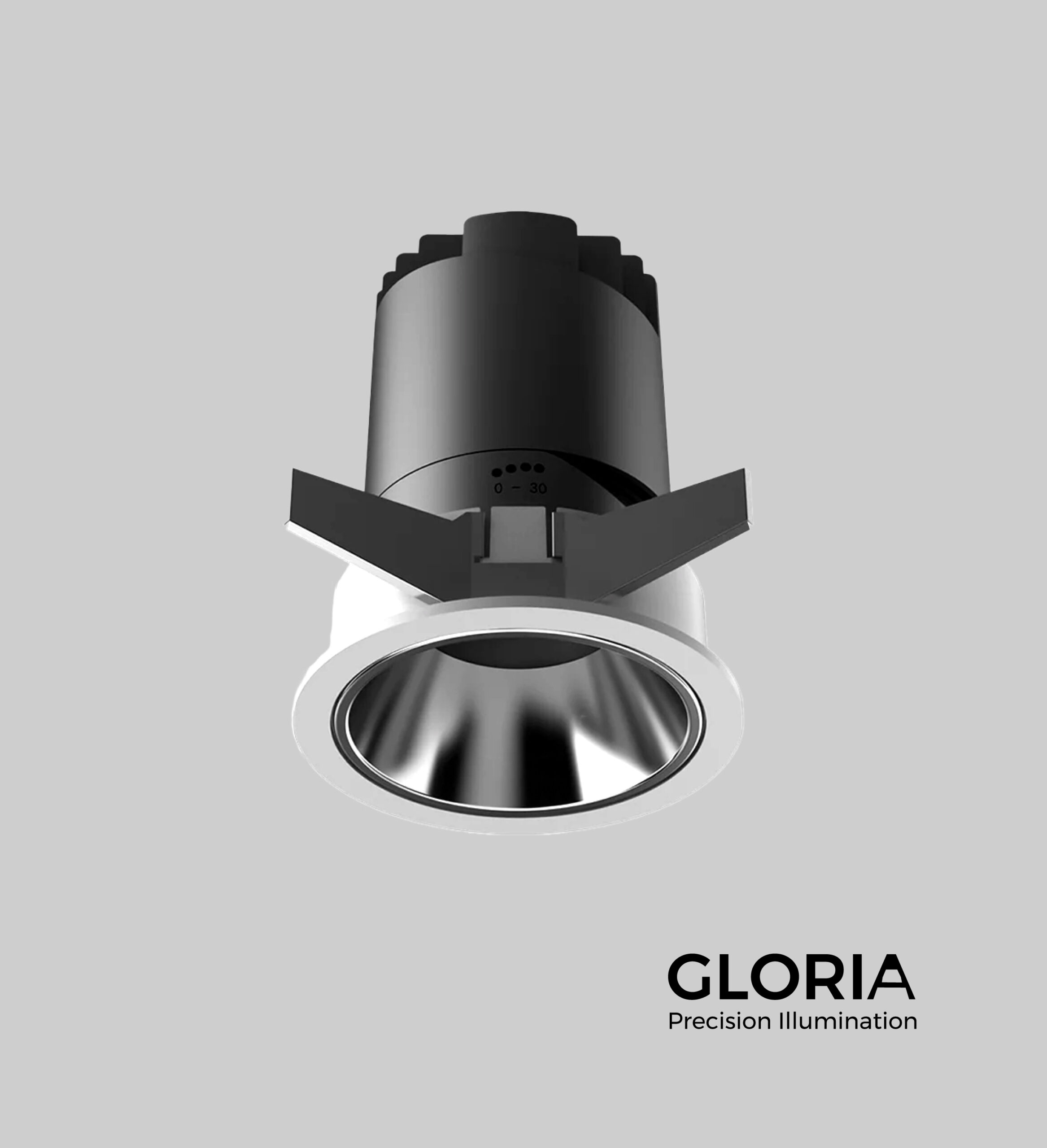 Designed with dark optics, GLORIA is a premium deep-recessed downlight, ensures low glare and a precise beam angle. At its heart lies the principle of precision illumination, emitting light with accuracy and efficiency, highlighting specific areas or features that demand focused attention.