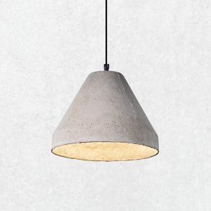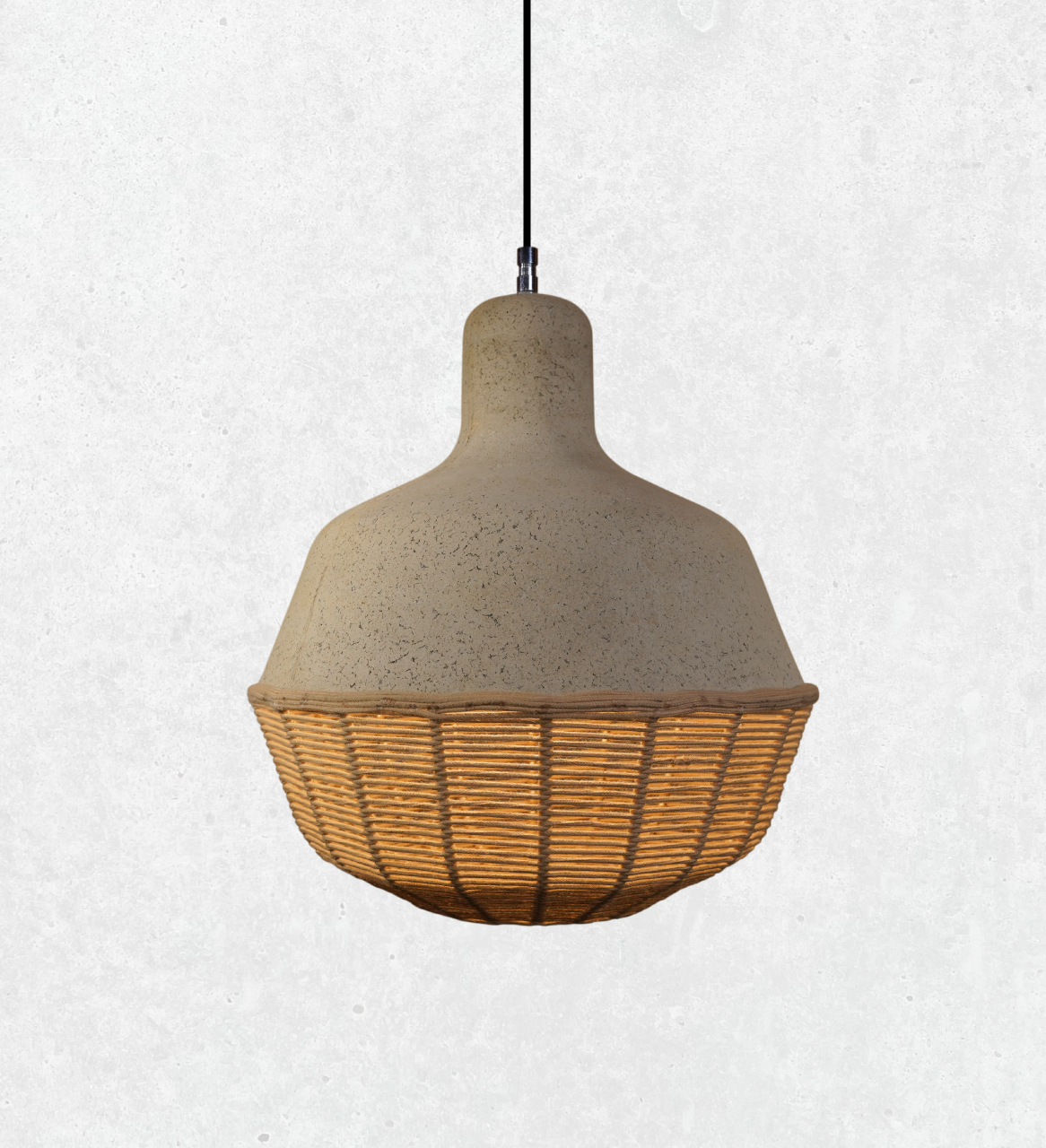 Unique, rustic pendant light features a demure, organic silhouette constructed from sustainable materials.